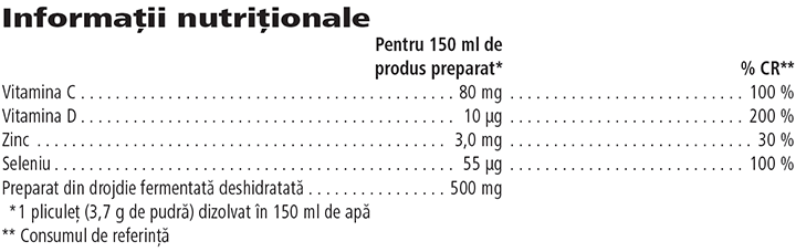 • Formula sa conține EpiCor® – ingredient dovedit științific, preparat din drojdie fermentată deshidratată.